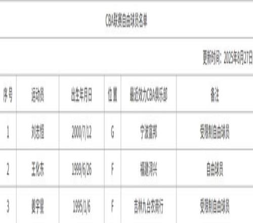 CBA官方更新自由球员名单:新增姜宇星&王化东&刘志恒