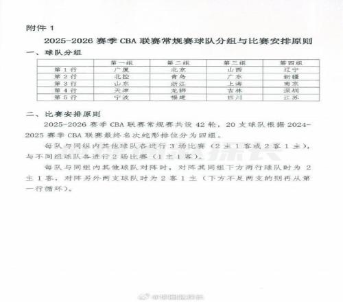 新赛季CBA各队分4组共42轮同组对手2客1主或1客2主&组外1客1主