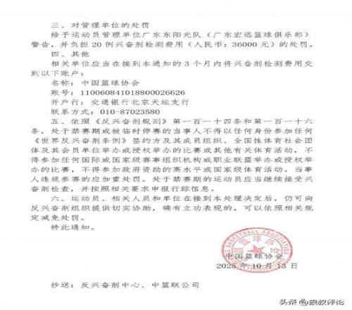 北京时间10月13日,中国篮球协会对兴奋剂违规的中国男子篮球职业联赛(CBA)外援吉伦沃特处以禁赛3个月的处罚,广东宏远篮球俱乐部作为管理单位受到了警告及负担20例兴奋剂检测费用(人民币36000元)的处罚,该单位的医疗与反兴奋剂负责人、队医林志达被给予警告处罚。 在国家体育总局反兴奋剂中心于2025年4月16日实施的赛内兴奋剂检查中,你单位男子篮球运动员吉伦沃特的A样本尿样检测结果呈大麻酚类(羧基四氢大麻酚)阳性。 接到阳性通知后,运动员放弃检测B样本,因此该运动员检测结果阳性成立,表明运动员曾使用禁用物质或禁用方法,构成兴奋剂违规。 运动员对该阳性作出了解释说明,并提供了证据材料。运动员能够证明在赛外摄入、使用禁用物质,并且与运动能力无关。接到兴奋剂违规通知后,运动员在规定时间内签署了结果管理回执单,承认兴奋剂违规,接受通知中指控的后果。 吉伦沃特和哈雷尔的大麻酚阳性事件是同时期出现,但是哈雷尔对其大麻酚阳性结果给出的相关证据还在核实过程中。因此,中国篮协先公布了对吉伦沃特的处罚决定,对哈雷尔的处罚决定将另行公布。 吉伦沃特目前已经是确定加盟中国台北联赛的富邦勇士,而目前已经证实非比赛期间违规使用兴奋剂,是否会受到追加的停赛的处罚相信是外界关注的焦点。 吉伦沃特兴奋剂违规也是CBA历史上第三例兴奋剂处罚案例 2012年12月9日,国家体育总局反兴奋剂中心在CBA山西汾酒集团队客场与吉林九台农商银行队比赛的赛内检查中,发现威廉姆斯的A瓶检测结果呈大麻(酚)类阳性。 山西中宇俱乐部和威廉姆斯本人已经声明放弃B瓶检测和听证会。 中国篮协根据《关于严格禁止体育运动中使用兴奋剂行为的规定》以及《国际篮联章程》相关规定,给予当事人威廉姆斯禁赛6个月的处罚,同时对山西中宇俱乐部主教练处以5000元罚款,对山西中宇俱乐部处以10000元罚款。 CBA山东高速俱乐部主力球员陶汉林遭遇的尿检风波1月10日有了定论,中国篮协根据相关事实,对其免予禁赛,但仍然给予球员本人和俱乐部相关人员罚款和警告处罚。 山东球员陶汉林在2016年10月30日国家体育总局反兴奋剂中心实施的赛内兴奋剂检查中,A样本检测结果呈蛋白同化制剂(克仑特罗)阳性。 收到阳性通知后,运动员本人提出了书面听证申请。同时,山东高速篮球俱乐部依照国家体育总局《体育运动中兴奋剂管制通则》,向中国篮协和反兴奋剂中心提交了书面情况说明和相关证明材料。 中国篮协根据有关规定,对陶汉林本人免予禁赛,按照违反运动队管理规定罚款5000元;给予山东高速篮球俱乐部负责人兼领队王宝瑞、主教练亚历山大·凯撒警告处分,给予山东高速篮球俱乐部警告和负担10例兴奋剂费用的处罚。核减山东高速篮球俱乐部参赛经费8万元。 |