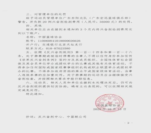 昨天(10月13日),中国篮球协会给广东东阳光队(广东宏远篮球俱乐部)下发《关于对篮球运动员Troy Akeem Gillenwater兴奋剂违规处理的通知》。通知提到,对兴奋剂违规的中国男子篮球职业联赛(CBA)外援吉伦沃特处以禁赛3个月的处罚。 通知表示,在国家体育总局反兴奋剂中心于2025年4月16日实施的赛内(2024-2025赛季CBA)兴奋剂检查中,广东东阳光队(广东宏远篮球俱乐部)男子篮球运动员Troy Akeem Gillenwater(吉伦沃特)的A样本尿样检测结果呈大麻酚类(羧基四氢大麻酚)阳性。 接到阳性通知后,运动员放弃检测B样本,因此该运动员检测结果阳性成立,表明运动员曾使用禁用物质或禁用方法,构成兴奋剂违规。 运动员对该阳性作出了解释说明,并提供了证据材料。运动员能够证明在赛外摄入、使用禁用物质,并且与运动能力无关。 接到兴奋剂违规通知后,运动员在规定时间内签署了结果管理回执单,承认兴奋剂违规,接受通知中指控的后果。 根据国家体育总局《反兴奋剂规则》的有关规定,作出如下处理决定: 一、对运动员的处罚 依照《规则》第九十五条,给予运动员Troy Akeem Gillenwater禁赛3个月的处罚,禁赛期自2025年10月13日至2026年1月12日。 二、对相关责任人的处罚 经核实,队医林志达为该俱乐部医疗与反兴奋剂负责人。依照《规则》第一百二十条、第一百二十三条,给予林志达警告的处罚。 三、对管理单位的处罚 给予运动员管理单位广东东阳光队(广东宏远篮球俱乐部)警告,并负担20例兴奋剂检测费用(人民币:36000元)的处罚。