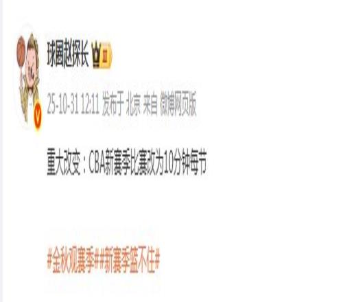 媒体人球圈赵探长报道:“重大改变:CBA新赛季比赛改为10分钟每节。” 媒体人导演我躺哪_basketball报道:“CBA公司公布25-26赛季比赛规则的重大改变:单节比赛由之前的12分钟改成10分钟。外援制度保持不变,仍然是4节7人次。”
