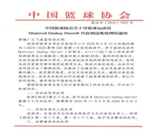 北京时间今日,中国篮协官方发布公告,上赛季效力于新疆男篮的外援蒙特雷兹-哈雷尔因兴奋剂违规被禁赛3个月,期限为2025年11月5日到2026年2月4日,新疆男篮则承担20例兴奋剂检测的费用共36000元。