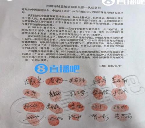重磅:四川男篮联名讨薪引发热议:全运会为何一掷千金 文/姜诗华 怪事年年有,今年特别多,以往在中国足坛才经常发生的球员联名讨薪,如今在中国篮坛也出现了。北京时间11月19日上午,体育媒体曝出惊人消息:四川男篮球员、教练、工作人员日前向篮协、CBA公司、四川省体育局发布联名信,请求解决四川男篮的欠薪问题。消息一出,瞬间引发网友热议。 联名信中,四川男篮全体成员表示他们遭遇欠薪3至9个月不等,且有部分奖金未发放,社保更是有28个月未交!联名信的最后有四川所有队员的签名和红手印。截止到目前为止,四川俱乐部,四川体育局和篮协以及CBA公司,尚未对此事进行回应。