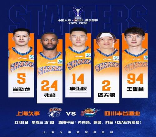 12月3日,南昌国际体育中心。第二届CBA俱乐部杯战幕拉开,卫冕冠军上海久事男篮以一场酣畅淋漓的111比72大胜,击败四川丰谷酒业队,强势开启B组小组赛征程。全队12人轮换、7人得分上双的团队表现,展现出“大鲨鱼”志在卫冕的决心与深厚阵容底蕴。 比赛从第一分钟起就进入上海队的节奏,首发五虎崔晓龙、弗格、李弘权、洛夫顿与王哲林迅速进入状态。王哲林内线连得5分开局,洛夫顿外线三分、抢断扣篮一气呵成,一波12比5的攻势奠定了基调,首节结束比分已拉开至36比20。