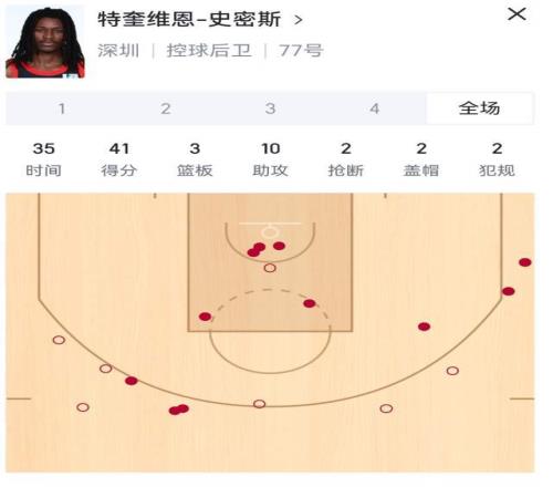 没想到,一个赛季之后,史密斯又回来了,不过,这一次,他没有再去加盟江苏男篮,而是加盟了深圳男篮。这支球队可是广东劲旅,休赛期动作很大,尤其是引入了外籍主教练,不让周鹏执教了。 12月4日晚上,对阵新疆男篮的比赛,史密斯迎来首秀,结果,这位控卫首发登场,就展现出了强大的实力,令人信服。 史密斯首发打了35分钟,18投11中,命中率61.1%,其中三分球11投5中,命中率45.5%,罚球16罚14中,命中率87.5%,砍下41分。而这是CBA俱乐部杯赛开赛之后,得分最高的存在了,不得不说,这史密斯的得分能力是真强。