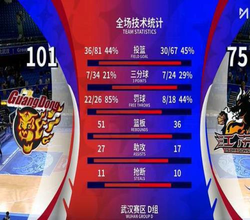广东男篮5人得分上双,徐杰再次爆发,10投6中,其中三分球7投3中,3罚3中,拿到18分4篮板8助攻2抢断。张昊12分3篮板,王洪泽15分8篮板3助攻,杨溢10分4篮板6助攻2抢断,奎因此役发挥不佳,16投4中,其中三分球5投0中,拿到8分4篮板1助攻。萨姆纳7投4中,5罚4中,拿到12分5篮板5助攻2抢断1盖帽。