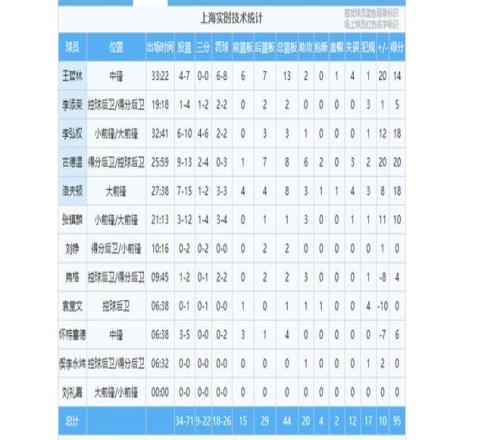 上海男篮首轮击败吉林男篮得到95分 其中外援弗格得到4分,洛夫顿得到18分,古德温得到20分,怀特塞德得到6分。外援累计得到48分,外援得分占比约为50.53%。