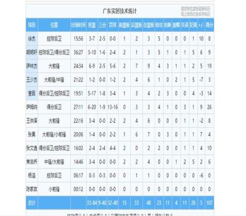 广东男篮首轮击败同曦男篮得到107分 其中外援萨林杰得到19分、奎因得到14分、萨姆纳得到26分。外援累计得到59分,外援得分占比约为55.14%。