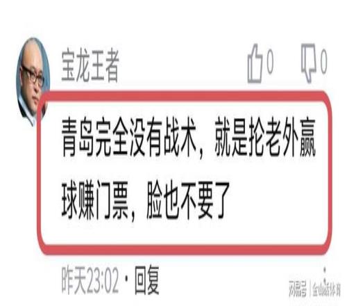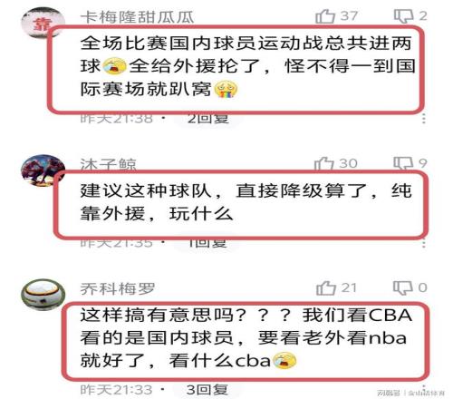 “全场比赛国内球员运动战总共进两,全给外援抡了,怪不得一到国际赛场就趴窝。”;“建议这种球队,直接降级算了,纯靠外援,玩什么?”;“这样搞有意思吗???我们看CBA看的是国内球员,要看老外看nba就好了,看什么cba”;“青岛打得太难看了,就两外援二人转,虽然赢了,没有同曦打得有意思。”……