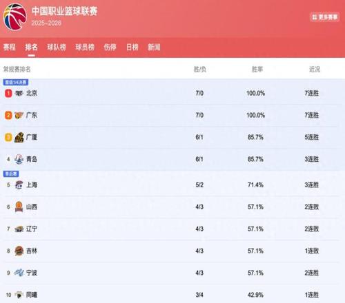 CBA排行榜洗牌:广东豪取7连胜再进前2,辽篮暴跌至第7,青岛黑马