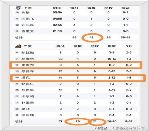 ①、篮板球狂输16个 从赛后的技术统计上看,广厦队本场比赛在篮板球的竞争中完全崩盘。 上海队全场拿到42个篮板球,广厦队只有26个,狂输16个。 赛后上海队主教练卢伟接受采访时对于球队的表现用“非常满意”来形容。尤其是提到了篮板球方面的表现,说赢了差不多有20个(最终赢了16个)。 ②、头号得分手布朗不在,两大“水货”难堪大任 可以说,广厦队除了胡金秋和桑普森两人发挥还算正常之外,其余的表现都比较拉胯。 孙铭徽只在首节轰出三板斧,此后基本隐身。 而国手朱俊龙则彻底退化成可有可无的蓝领式球员,虽然在最后时刻因伤下场,但在场上的时间几乎没有任何贡献,2次投篮一分未得。 当前阶段的朱俊龙,毫无进攻能力,本赛季11场比赛,得分超过5分的比赛,印象中屈指可数,完全无法匹配首发身份。 这样的状态和毫无进攻能力,郭士强的国家队也要考虑是否继续征用了。 另外一个发挥拉胯的就是外援塔克。 14分的得分,几乎都来自罚球,这场比赛塔克化身铁神,总投篮12中2、三分球8中1,追分时频频打铁,实在辣眼。