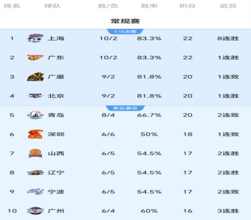 本场比赛,广东队的取胜最大功臣,无疑是外援奎因,全场19投12中,三分7中3、罚球3中3,砍下30分6篮板9助攻4抢断。不过两位本土双核发挥不佳,徐杰得到9分4篮板4助攻、胡明轩得到3分4篮板1助攻。 最新积分榜如下——