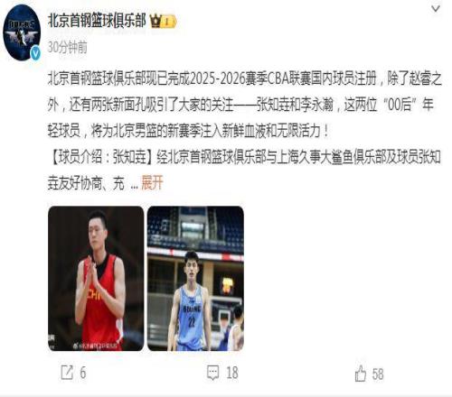 根据CBA官网公布的注册情况,北京男篮目前已经注册了16位国内球员,北京男篮官方公告也是写道:“北京首钢篮球俱乐部现已完成2025-2026赛季CBA联赛国内球员注册,除了赵睿之外,还有两张新面孔吸引了大家的关注——张知垚和李永瀚,这两位‘00后’年轻球员,将为北京男篮的新赛季注入新鲜血液和无限活力!”