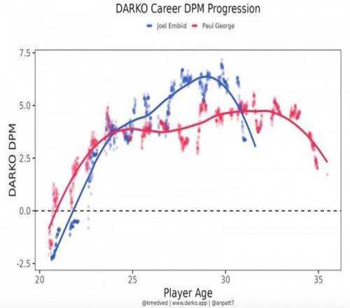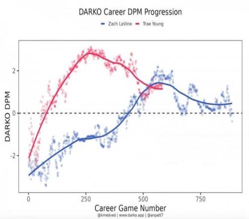 横轴为生涯出场数,纵轴为量化后的表现;蓝色代表拉文,红色代表杨 在以前的劳资协议下,提前续约杨和拉文这样的球员是无需思考的决定,但那些日子已经一去不复返了。据The Athletic记者萨姆-阿米克报道,拉文在这个休赛期有资格获得提前续约,但国王更倾向于把钱付给“一个能成为他们长期蓝图一部分的更年轻的球员”。而拉文才30岁。