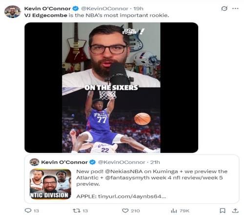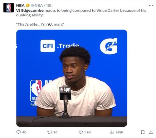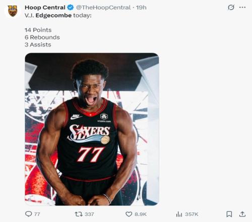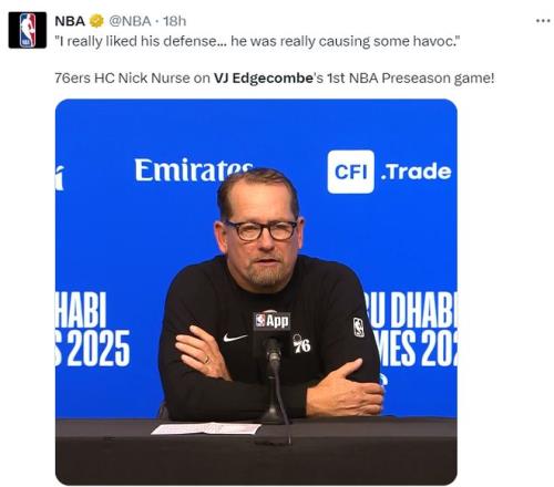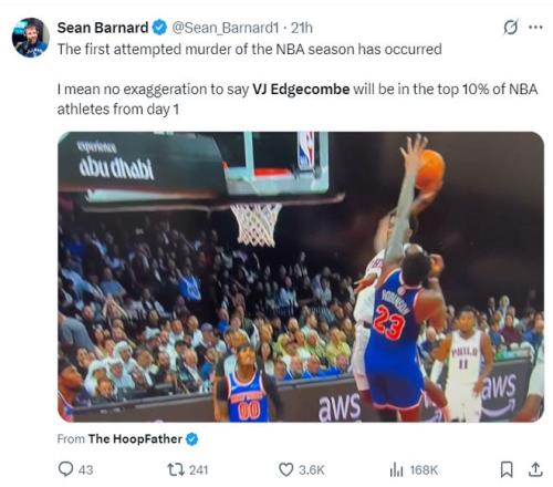NBA季前赛已经打响,费城76人首战84-99不敌纽约尼克斯,这场比赛尼克斯展现了更多充盈的板凳深度,费城这边恩比德、乔治两个巨头都因伤缺席,不过此役马克西+埃奇库姆的后场组合让费城球迷看到了未来。 此役埃奇库姆全场比赛,30分钟,13中4,三分6中1,罚球5中5,拿到14分6篮板3助攻1失误,命中率30.8%,三分命中率16.7%,他这个效率值却成为媒体争相报道的对象,这是为何? 当然是因为这一球,他险些用格里芬式的‘流星灌篮’隔扣了身高7尺(2.13米)的米罗,要知道米罗臂展2.24米。已知埃奇库姆身高1.96米,臂展2.02米,原地起跳76.2厘米,助跑起跳97.79厘米(联合试训时的体测数据),他差点隔扣米罗足以证明他的身体天赋多么出色。 费城记者Sean Barnard写道:NBA新赛季的第一场比赛就险些出现了逆天隔扣,我毫不夸张的说,埃奇库姆会成为NBA天赋排名前10%的球员。 赛后有记者询问埃奇库姆的扣篮跟文斯-卡特是否有相似之处?埃奇库姆说:卡特?那才是真的精英级的扣将。 纳斯在赛后谈到埃奇库姆:我非常喜欢他在防守端的表现,他确实制造了不少麻烦,他对抗经验丰富球员的方式让我印象深刻。(几天前的媒体日,纳斯还曾表示埃奇库姆在新赛季会有比赛客串控卫,他有些比赛也可以打小前锋) NBA记者凯文-奥康纳则评价埃奇库姆会成为NBA最具影响力的球员之一。 埃奇库姆是巴哈马人,他去年代表巴哈马打奥运落选赛,场均27.5分钟,拿到16.5分5.5篮板3.8助攻2抢断0.5盖帽,命中率57.1%,三分命中率38.5%,打FIBA成年赛他就已经如此出色了。 |