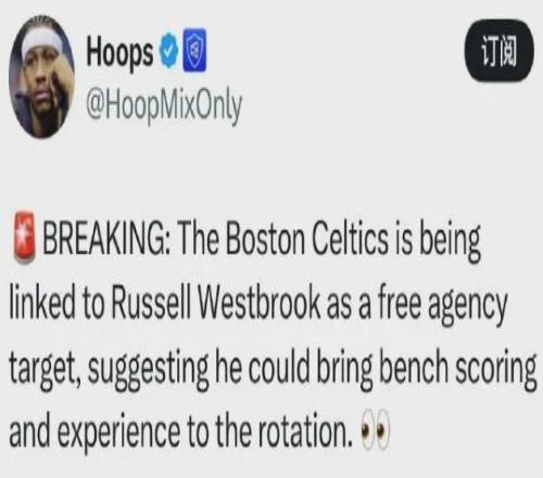 恭喜,提前恭喜了。 据美媒Hoops报道,凯尔特人有意在自由市场签下威少。