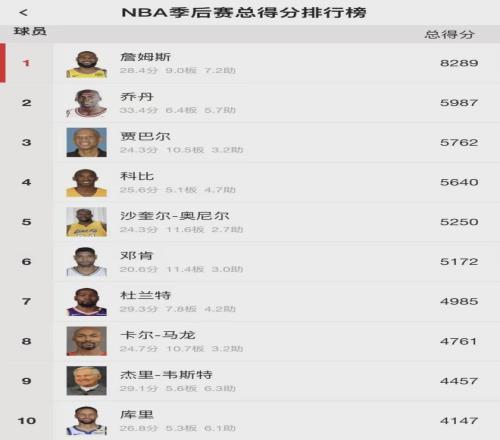 詹姆斯季后赛出场数、出场时间、总得分、总抢断、总出手、总进球、总打铁、总罚球、总失误等多项数据,均是历史第一。季后赛三双次数和总助攻数均是历史第二,两双次数和三分命中数均是历史第三,总篮板历史第四。