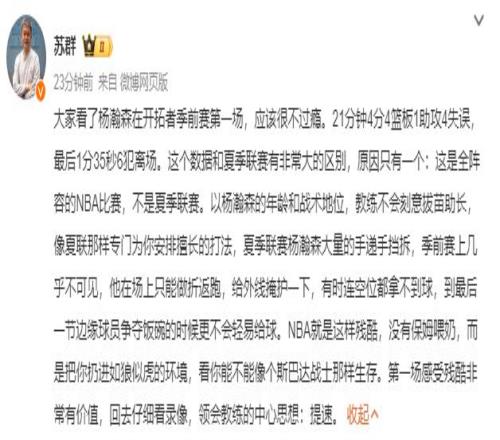 北京时间10月9日,NBA季前赛123-129不敌勇士,替补出战21分钟,5投2中、三分2中0拿到4分4篮板1助攻,出现4次失误6次犯规,末节犯满毕业略显无奈。 在开拓者被勇士逆转的比赛中,杨瀚森上半场替补登场10分钟,仅仅出手一次,错失空位三分,因此上半场没有得分进账;下半场,杨瀚森第三节终于得分,打进首球后释怀大笑,之后补篮得分,可末节杨瀚森在场上不仅没有得分进账,而且单节吃到4次犯规,累计6犯毕业,只能无奈下场。 杨瀚森季前赛首秀引热议,国内评论员苏群写道:大家看了杨瀚森在开拓者季前赛第一场,应该很不过瘾。21分钟4分4篮板1助攻4失误,最后1分35秒6犯离场。这个数据和夏季联赛有非常大的区别,原因只有一个:这是全阵容的NBA比赛,不是夏季联赛。以杨瀚森的年龄和战术地位,教练不会刻意拔苗助长,像夏联那样专门为你安排擅长的打法,夏季联赛杨瀚森大量的手递手挡拆,季前赛上几乎不可见,他在场上只能做折返跑,给外线掩护一下,有时连空位都拿不到球,到最后一节边缘球员争夺饭碗的时候更不会轻易给球。NBA就是这样残酷,没有保姆喂奶,而是把你扔进如狼似虎的环境,看你能不能像个斯巴达战士那样生存。第一场感受残酷非常有价值,回去仔细看录像,领会教练的中心思想:提速。 |