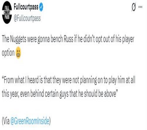北京时间10月10日,36岁的威少真要无缘回归NBA吗?国王记者报道,威少可能已经收到中国球队的巨额合同;另外,前NBA球员丹尼-格林爆料,若未拒绝球员选项,掘金将会在新赛季直接弃用他。 今年休赛期,威少拒绝执行与掘金队最后一年价值347万美元的球员选项,成为自由球员后一直处于待业状态,目前距离新赛季开打还有12天,威少仍未签约任何球队。 国王记者Carmichael Dave透露,威少可能收到了一份来自中国球队的报价;该记者在节目中表示:我从一个足够信任的人那里听到了一些消息,威少可能收到了来自中国的一份为期约半个赛季的合同,这个合同的待遇几乎是国王所能提供的待遇的四倍。 美记者曾报道国王和火箭有意威少,不过这只是流言而已;对于威少可能加盟火箭的流言,杜兰特曾表示:威少是传奇,我觉得他应该继续留在,而且我认为他理应按照自己的意愿离开NBA。 NBA 究竟威少为什么选择跳出合同?前NBA球员丹尼-格林在节目中透露,威少决定拒绝球员选项的原因是,掘金方面并没有打算让他进入轮换阵容,而是准备让他长期坐在板凳末端;消息人士称:据我所知,他们(掘金)今年根本没打算让他上场,甚至要把他排在某些本应在他之下的球员后面。 |