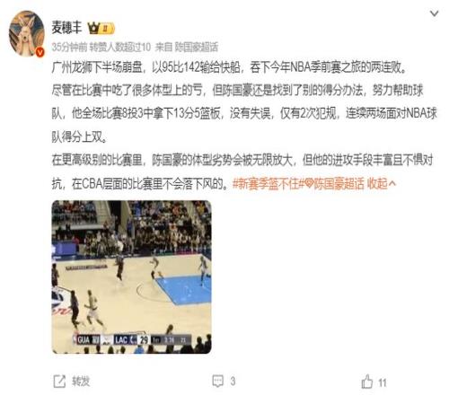 北京时间10月10日,NBA季前赛,CBA广州男篮95-142惨败NBA洛杉矶快船男篮,这场比赛广州队是在下半场崩盘,第三节8-42被碾碎,第三节打完后比赛实际上就已经进入垃圾时间,快船开始上第三阵容。