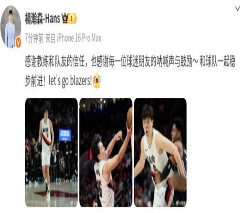 雷速体育10月11日讯 今日NBA季前赛,开拓者124-123国王,此役,杨瀚森砍下16分4篮板3盖帽1助攻,赛后,杨瀚森在社媒分享了自己的感受。 社媒原文:“感谢教练和队友的信任,也感谢每一位球迷朋友的呐喊声与鼓励,和球队一起稳步前进!let's go blazers!” |