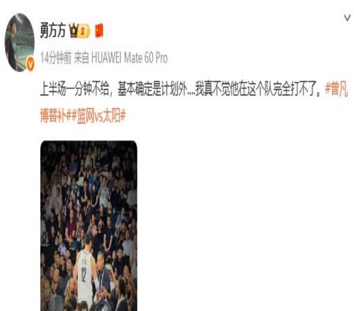 雷速体育10月12日讯 今日NBA季前赛中国赛继续进行,篮网与太阳进行第二次交手,上半场中国球员曾凡博未能获得任何出场时间。 北京媒体人“勇方方”评论表示:上半场一分钟不给,基本确定是计划外.,我真不觉他在这个队完全打不了。    |