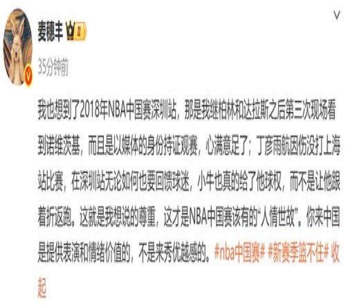 雷速体育10月13日讯 昨日NBA中国赛第二场,篮网球员曾凡博没有得到出场机会。 对此,媒体人麦穗丰社媒发文吐槽,NBA球队来中国是提供表演和情绪价值的,不是来秀优越感的。 原文如下: “我想到了2018年NBA中国赛深圳站,那是我继柏林和达拉斯之后第三次现场看到诺维茨基,而且是以媒体的身份持证观赛,心满意足了。丁彦雨航因伤没打上海站比赛,在深圳站无论如何也要回馈球迷,小牛也真的给了他球权,而不是让他跟着折返跑。这就是我想说的尊重,这才是NBA中国赛该有的“人情世故”。你来中国是提供表演和情绪价值的,不是来秀优越感的。” |
