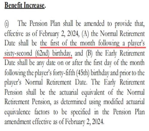当然了,这并不是说姚明已经开始从NBA领养老金了,只是根据NBA劳资协议的规定,姚明已经有资格从NBA领取养老金,至于要不要开始领,可能确实要找伊戈达拉聊聊。 NBA劳资协议条款里明确指出:正常退休日期应为球员62岁生日后的第一个月的第一天;但同样可以选择从45岁生日次月的第一天到正常退休日期前的任意一天。早领早受益,但同时每月领取的金额会按规定系数削减,晚领晚受益,相应的正常退休再领,每月可以领取全额,联盟自然是鼓励球员从正常退休日期开始领。