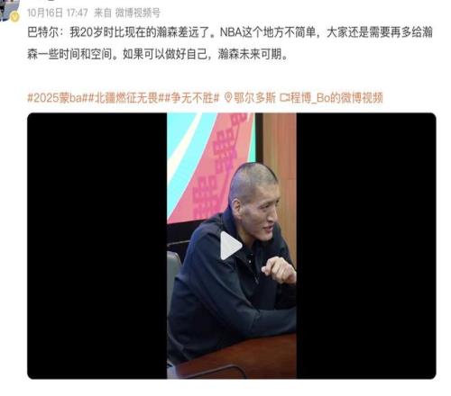 就在日前,姚明的国家队老队友,也就是我们中国男篮的名宿巴特尔,在最新一次活动当中,谈到了自己对于杨瀚森这位小老弟的看法。他认为小杨比自己当年20岁的时候强多了,认为他前途无量。各位球迷都知道,当年巴特尔也曾经闯荡过NBA,甚至还跟随球队拿到过总冠军的戒指,后来在国家队也取得过辉煌的战绩,在黄金一代中国男篮里面拥有着很强大的影响力。