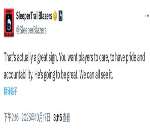 开拓者球迷账号SleeperTrailBlazers写道:“这其实是个非常好的信号。你总希望球员们能投入真心、有荣誉感、敢承担责任。他一定会变得很出色,我们所有人都看得出来。”