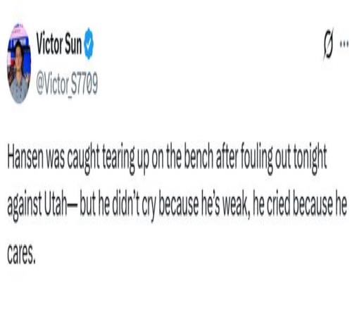前方记者Victor Sun在社媒上发出了瀚森落泪的一幕,配文写道:“瀚森犯满离场后,坐在板凳席上哭了——但他哭不是因为他软弱,而是因为他在乎。”