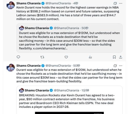 北京时间10月19日,火箭队球星凯文-杜兰特的商业伙伴兼Boardroom首席执行官里奇-克莱曼告诉ESPN,杜兰特已同意与火箭达成一份为期两年、价值9000万美元的合同续约,其中2027-28赛季为球员选项。 杜兰特本有资格获得一份为期两年、价值1.2亿美元的顶薪续约合同,但他在选择火箭队作为交易目的地时就明白,他将在新合同中牺牲一部分薪水——在这种情况下大约是3000万美元——这样双方可以长期合作,并为球队在阵容建设上提供灵活性。 37岁的杜兰特目前以5.982亿美元的职业生涯总薪资(基于当前和未来薪资)创下了NBA历史最高纪录,超过了勒布朗-詹姆斯的5.839亿美元。杜兰特本赛季的薪资为5470万美元,他的合同现在总共有三年,价值1.447亿美元。 火箭队在7月份通过NBA历史上最大规模的一笔交易得到了杜兰特,这是一笔历史性的七队交易,将杰伦-格林、狄龙-布鲁克斯、首轮第10顺位选秀权卡曼-马卢阿奇以及次轮选秀权拉希尔-弗莱明和科比-布雷亚送到了菲尼克斯太阳队。杜兰特的加入使火箭队——上赛季西部第二种子球队——成为了真正的NBA总冠军争夺者,他将与两届总冠军和两届总决赛最有价值球员与年轻球星阿尔佩伦-申京和阿门-汤普森联手。 作为15次入选全明星的球员,杜兰特为火箭队提供了一位顶级的跳投手和得分创造者,他可以无缝融入球队阵容。根据Genius IQ的数据,上赛季他的跳投命中率为49.7%,在NBA中排名第一,中距离投篮命中率为53.1%,运球后跳投命中率为50.9%,是所有球员中最高的。这些都是杜兰特将为火箭队带来持续影响的方面,根据Genius IQ的数据,火箭队上赛季在运球后跳投的有效投篮命中率排名第27位,在所有跳投的有效投篮命中率排名第24位。火箭队的场均单打次数排名第七,但每次直接单打的得分排名第27位。 上赛季,杜兰特在太阳队的62场比赛中场均得到26.6分、6.0个篮板和4.2次助攻。根据ESPN的研究,这位未来的名人堂成员已经连续三个赛季场均至少得到25分,投篮命中率达到50%,三分球命中率达到40%,这是NBA历史上最长的纪录。 杜兰特在NBA职业生涯总得分中排名第八,如果他本赛季至少得到990分,就可以超过威尔特-张伯伦和德克-诺维茨基。他连续16个赛季场均至少得到25分,在联盟历史上仅次于詹姆斯(连续20个赛季)。杜兰特在俄克拉荷马城雷霆队、布鲁克林篮网队和太阳队的队史场均得分均排名第一,在金州勇士队的队史场均得分排名第二,仅次于张伯伦。 除了杜兰特的交易和续约,火箭队还在休赛期完成了其他重要的事务。他们与教练伊梅-乌多卡、弗雷德-范弗利特、史蒂文-亚当斯和小贾巴里-史密斯达成了新的合同,在自由球员市场上签下了多里安-芬尼-史密斯、克林特-卡佩拉和乔什-奥科吉,并重新签下了老将杰肖恩-泰特、阿隆-霍乐迪和杰夫-格林。 最新赔率中,休斯顿火箭队赢得今年NBA总冠军的赔率为14-1,排名第五。火箭队将于10月22日在客场开启常规赛,对手是卫冕冠军雷霆队。 |
