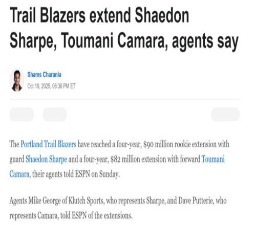 在常规赛即将开打之际,开拓者队豪掷1.72亿美元接连与夏普、卡马拉两名新星完成续约。