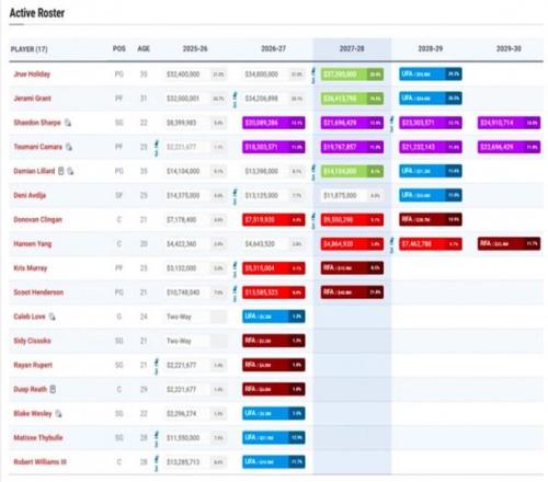 目前开拓者大名单中共有8名球员手握至少3年合同:利拉德、格兰特、夏普、卡马拉、阿夫迪亚、霍勒迪、克林根、杨瀚森。