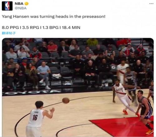 并且配文称赞道:“杨瀚森季前赛表现抢眼!”