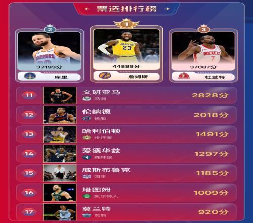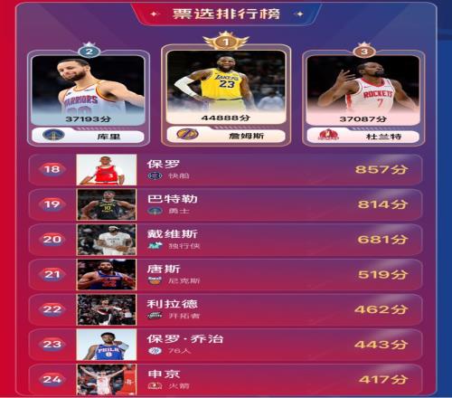 雷速体育10月20日讯 今日,雷速体育NBA30大球星评选活动已完满落幕,感谢各位老哥对本次活动的支持。 本次活动,通过第一阶段无限PK模式决出胜率前五十位球星,再由第二阶段的票选方式选出老哥们最喜欢的30位球星,最终分数最多的球星,当选NBA新赛季30大球星雷速人气王。 经过角逐,最终,湖人球星勒布朗·詹姆斯以44888分的高分一骑独尘,获得"雷速人气王"称号,让我们掌声鼓励! 本次NBA30大球星具体排名如下: |