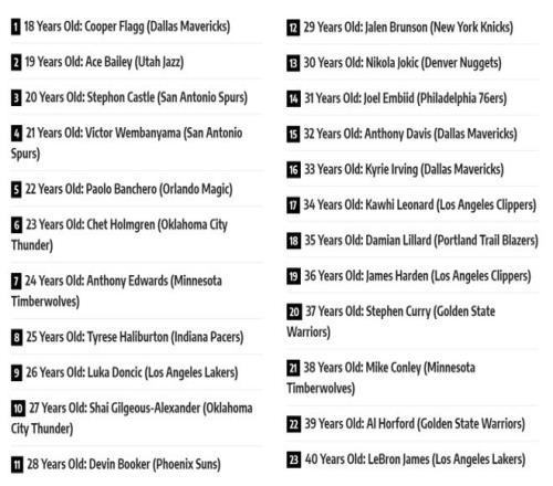 在常规赛即将开打之际,美媒《fadeawayworld》按照能力与状态公布NBA现役各年龄最佳球星名单,其中37岁库里击败杜兰特,独行侠3大状元齐入选。 超新星:弗拉格(18)、艾斯贝利(19)、卡斯尔(20)、文班(21)、班凯罗(22) 该年龄段均为超级新星,其中班凯罗、文班、卡斯尔分别是22-24年最佳新秀,也在所在球队扮演着核心角色,尤其是文班亚马,随着其摆脱血栓困扰与核心力量提升,他已经做好竞争MVP的准备。 弗拉格与艾斯贝利则是25年选秀最受期待的两名新星,其中状元弗拉格被誉为“美国之子”,也在季前赛中展现出全面身手。 相比之下,艾斯贝利则在季前赛展现出了顶级的身体天赋,打破了外界对于他的质疑。 新生代巨星:霍姆格伦(23)、爱德华兹(24)、哈里伯顿(25)、东契奇(26)、亚历山大(27) 相比于前一档仍处于新秀合同中的新星,这一年龄段的球员大部分已经拿下大合同,并在联盟中建立起了属于自己的地位。 尤其是东契奇、爱德华兹与亚历山大,前者完成瘦身后将是MVP的有力竞争者,也将是超级豪门湖人队的未来核心。 爱德华兹则是美国本土新生代的代表,休赛期钻研乔丹与科比的背身技术后,新赛季有望进一步蜕变,亚历山大凭借出神入化的造犯规技术在上个赛季拿下MVP、总冠军与FMVP,无疑是最适合当下联盟吹罚标准的巨星。 中生代巨星:布克(28)、布伦森(29)、约基奇(30)、恩比德(31)、浓眉哥(32) 受困于伤病与球队实力问题,本应撑起NBA门面的中生代巨星整体质量并不高,尤其是恩比德遭遇重伤后。 好在约基奇一直保持着绝对统治力,过去5年一直都是MVP前二人选,更是3次拿下该奖项,新赛季随着掘金队全面补强,约基奇也迎来再次冲击总冠军的机会。 老一代巨星:欧文(33)、小卡(34)、利拉德(35)、哈登(36)、库里(37) 对于大部分NBA球员来说,当他们步入生涯这一阶段时,大都将沦为角色球员,哪怕是超级巨星也不得不接受转型。 只有像库里这种历史级别球星才能依旧保持着绝对比赛统治力,仍旧在所在球队扮演着顶尖核心角色。 并且现役37岁最佳球员的竞争十分激烈,还有像杜兰特这种超级得分手候选,但最终库里击败老对手拿下胜利。 康利(38)、霍福德(39)、詹姆斯(40) 步入这一档的球员所要面对的竞争已经非常小,因为他们几乎是所在年龄段唯一的选择,但这并不意味着他们的能力不够突出,能够在如此高龄依旧留在竞争激烈的NBA已经足以说明一切。 尤其是40岁的詹姆斯,他仍旧身背顶薪合同,大部分时间依旧保持着出色的影响力,也有漂亮的数据输出。 更重要的是,詹姆斯还有着巨大的个人影响力,无论是在场上,还是在场下,他的一举一动都牵动着所有人的注意力,也在一次又一次刷新历史纪录。 具体名单如下 |