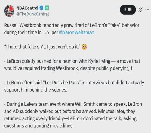 Yaron Weitzman在文中描述,威少爷对詹姆斯的行为感到难以置信,后者每说一次话,威少爷就翻一次白眼。 “我讨厌这一套假惺惺(I hate that fake shit)。”威少爷在拍照时对身边的人说道。