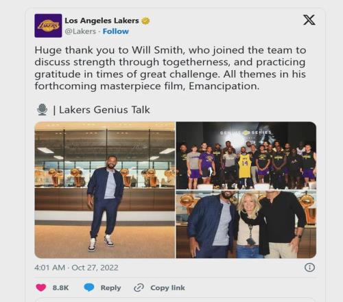 随后,这个分享会正式开始,威尔·史密斯侃侃而谈,还要接受湖人球员的提问,于是詹姆斯第一个发问,并且一个接一个地提问题,硬是把原本半小时的活动延长到了接近一小时。 一位当时在现场的人回忆道:“一个想离开的人却不断地引用电影台词,回忆人家的人生。”