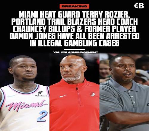 其中被抓的人就包括 开拓者的教练比卢普斯 还有热火球员罗齐尔 以及NBA前球员达蒙-琼斯