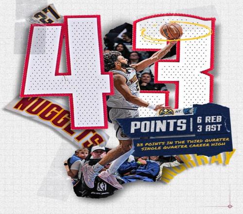 值得一提的是,约基奇在此役还创下了NBA历史第2的神迹。数据显示,约基奇今日以90%命中率砍下25+15+10,加入张伯伦,成为历史上第二位做到的球员。 穆雷43+6+单节23分暴走 掘金队后场球星贾马尔穆雷,在进攻端状态爆棚。穆雷上场37分钟,29投16中,三分9中5、罚球7中6,狂砍43分6篮板3助攻,正负值+30冠绝全场。穆雷以55%的命中率轰下了全场的最高分,还以45%的命中率投进了此战最多的5记三分球。穆雷在中远距离的得分效率很高,并且他冲击内线也有着优秀的成功率。 穆雷爆发