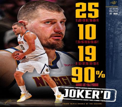 掘金力擒森林狼 掘金队,小哈达威11中7,三分球6中4高效的砍下了20分1板3助,第3节砍下15分成为取胜功勋。沃特森12分2板1助2帽、戈登10中3仅仅得到9分3板3助、布劳恩7分3板2助2断、卡梅隆约翰逊5分2板2助,因伤退场。瓦兰丘纳斯4分4板、布鲁斯布朗4中1得到了2分5板。 约基奇25+19+10创NBA历史第2神迹 掘金队超级巨星尼古拉约基奇,在该场比赛迎来暴走。约基奇在36分钟的上场时间里,10中9,罚球7中7,狂轰25分19篮板10助攻2抢断1盖帽的大号三双数据,正负值+17高居全场第三。约基奇在进攻端予取予求,他仅仅投丢1球,有着90%的极高命中率。并且,约基奇在此役没有远投出手。在禁区肆虐的约基奇,展现了顶级的内线进攻技术。 戈贝尔防守约基奇