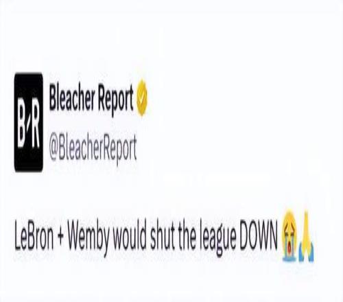 10月28日,在湖人落败开拓者之后,知名美媒Bleacher Report更新社交账号,发文写道: “詹姆斯和文班亚马这对组合能直接统治联盟啊!马刺应该寻求交易詹姆斯,让这两位状元联手。” 虽然只是一则媒体的预想消息,但足以引起球迷圈热议。主要还是在于文班亚马本赛季的开局实在是太疯狂了。