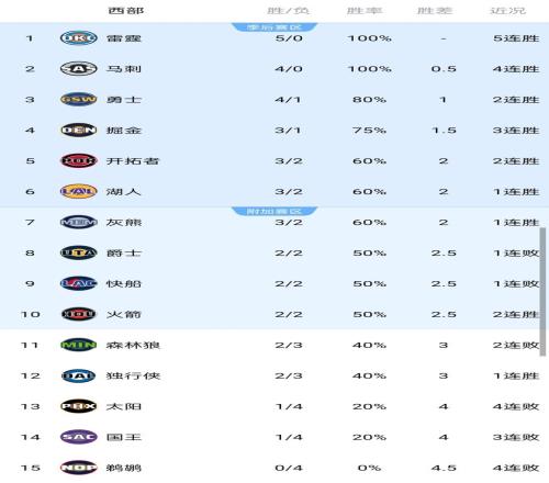 另外2场比赛 除了上面所说的2场比赛外,灰熊在莫兰特的率领下,以114:113准绝杀太阳,掘金则以122:88大胜鹈鹕,约基奇轻松拿到21+12+10的三双。此外,杜兰特状态回暖,砍下31分5篮板,帮助火箭以139:121大胜猛龙。下面是西部各球队具体排名,雷霆和马刺依旧保持不败金身,分别排名前二,勇士则4胜1负高居第3。
