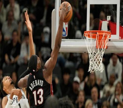 威金斯篮下得手,瓦塞尔回敬三分球。卡斯尔抢断,瓦塞尔2罚1中,凯尔登约翰逊罚中2球。史密斯、阿德巴约相继冲击内线得分,丰泰基奥3罚全中,阿德巴约勾手得分,热火打出了9比0的攻势。哈珀外线取分,麦克劳林抢断,凯尔登约翰逊低位打进,文班亚马2罚全中,麦克劳林轰进远投,马刺回敬10比0的小高潮稳住局面。哈克斯篮下得手,首节打完,热火以31比33落后,阿德巴约单节砍下10分。 次节较量,哈珀与阿德巴约在外线斗法,史密斯上篮打进,哈珀冲击内线取分还以颜色。丰泰基奥轰进2基三分球,圣安东尼奥请求暂停。哈珀快速上篮得手,拉松回敬三分球,卡斯尔2罚1中,瓦塞尔中距离得分。丰泰基奥轰进三分球,卡斯尔抢断后被犯规,并2罚1中。文班亚马勾手打进,威金斯抢下前场篮板,随后中投连得4分还以颜色。 威金斯强攻篮下