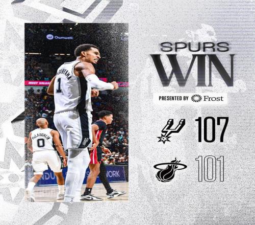 阿德巴约抛投命中,两队远投命中率下滑,文班亚马助攻瓦塞尔轰进三分球,文班亚马远投得分,马刺打出了8比2的攻势稳住局面,迈阿密请求暂停。哈克斯2罚全中,巴恩斯回敬外线得分,阿德巴约勾手取分,巴恩斯2罚全中还以颜色。威金斯失误,卡斯尔轰进三分球,文班亚马大帽米切尔,随后反击上篮得分。马刺重新取得11分领先,威金斯轰进续命远投,文班亚马大帽阿德巴约,阿德巴约回敬三分球,文班亚马2罚1中,阿德巴约远投三不沾,比赛时间走完。最终,马刺以107比101险胜热火,得以拒绝15分逆转。 两队数据 热火队,威金斯18中11空砍24分6板2助2断、丰泰基奥3分球7中5独得18分3板2助、米切尔11分1板4助、哈克斯6分8板6助、史密斯6分2板5助、拉松5分3板3助、韦尔7板3助、约维奇1板1助。 马刺力擒热火,豪取5连胜