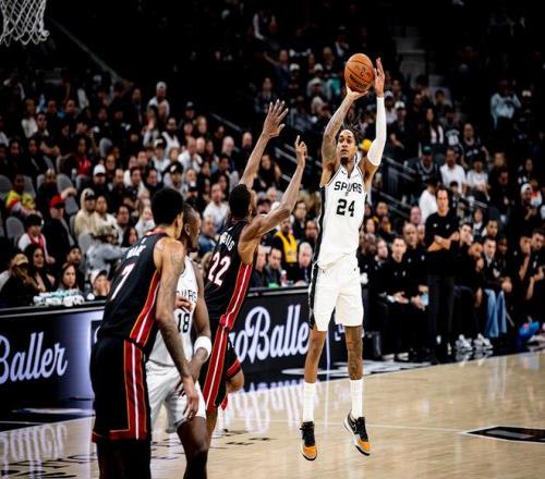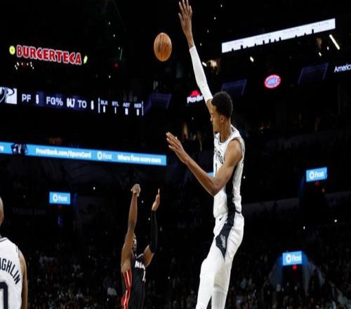 NBA常规赛继续进行,马刺坐镇主场与热火展开对决。圣安东尼奥豪取4连胜,战绩高居西部第2,本赛季强势崛起。福克斯、索汉、科内特、奥利尼克、沃特斯继续伤停,马刺沿用了文班亚马、卡斯尔、瓦塞尔、巴恩斯与尚帕尼的首发五虎。迈阿密实现了3连胜,实力不容被低估。此役,诺曼鲍威尔、泰勒希罗、罗齐尔伤停,斯波尔斯特拉的首发五虎是阿德巴约、威金斯、拉松、韦尔与米切尔。文班亚马与阿德巴约两大强力内线的较量,是此役的最大看点。 文班亚马27+18+6+5盖帽创NBA历史第1神迹,马刺5连胜创2大纪录!阿德巴约31+10! 全场比赛回顾 首节开打,瓦塞尔外线命中,米切尔、尚帕尼各有篮下得分,文班亚马补篮得手,阿德巴约回敬三分球。威金斯与卡斯尔、文班亚马在禁区斗法,卡斯尔大帽阿德巴约,米切尔回敬追身三分球。威金斯2罚不中,阿德巴约外线得分,马刺请求暂停。拉松抛投得手,巴恩斯与米切尔外线对轰,热火挑战判罚失败,卡斯尔打成了2+1。 阿德巴约暴扣