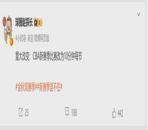 由于需要给全运会比赛让路,CBA新赛季需要到12月12日才拉开大幕,明年的4月24日收官。 常规赛共42轮,揭幕战为广厦对阵山西。 和之前的规则一样,上赛季的20支,球队根据蛇形排位,最终确定了分组形式。每支球队将与同组对手交锋3次,与非同组对手交锋2次。 A组:广厦队、北控队、山东队、天津队、宁波队;B组:北京队、青岛队、浙江队、广州队、福建队C组:山西队、广东队、上海队、吉林队、四川队;D组:辽宁队、新疆队、同曦队、深圳队、江苏队。 今天,咱聊一个关于自家联赛的话题吧。 根据球圈赵探长的消息,CBA新赛季将会有一大改变:比赛改为10分钟每节。 从48分钟到40分钟,确实是很大的规则改变。 自然的,6犯离场也会变成5犯。