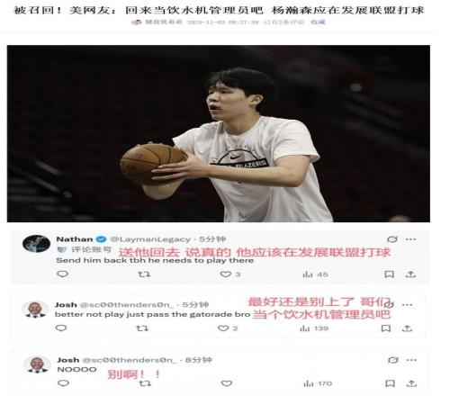 大家普遍担忧的是,若球队只是利用他的身份进行营销包装,而非真正给予成长空间,那么这不仅不利于其职业生涯发展,甚至可能毁掉一名潜力新星的未来。 相比之下,部分海外球迷则表现出明显冷淡甚至排斥的态度。 有美国网友在社交媒体直言:“不如让他继续留在发展联盟好好打磨技术,别总想着回主队凑热闹。”还有人讽刺道:“就算回来了,估计也只能坐在替补席递毛巾、看饮水机,根本帮不上忙。” 事实上,杨瀚森目前的处境颇为微妙。