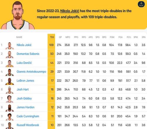 独一档,约基奇过去4个赛季砍下109次三双,第二名小萨仅50次
